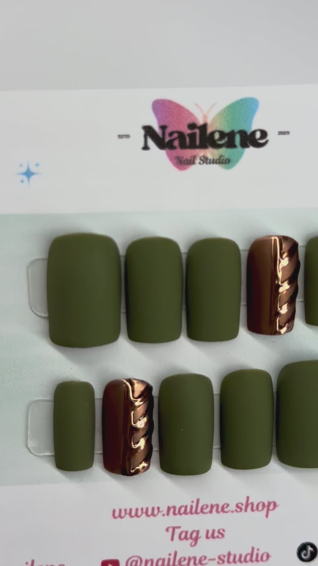 Matte green press-on nails accented with shimmering gold for a chic, earthy, and elegant look perfect for any season.