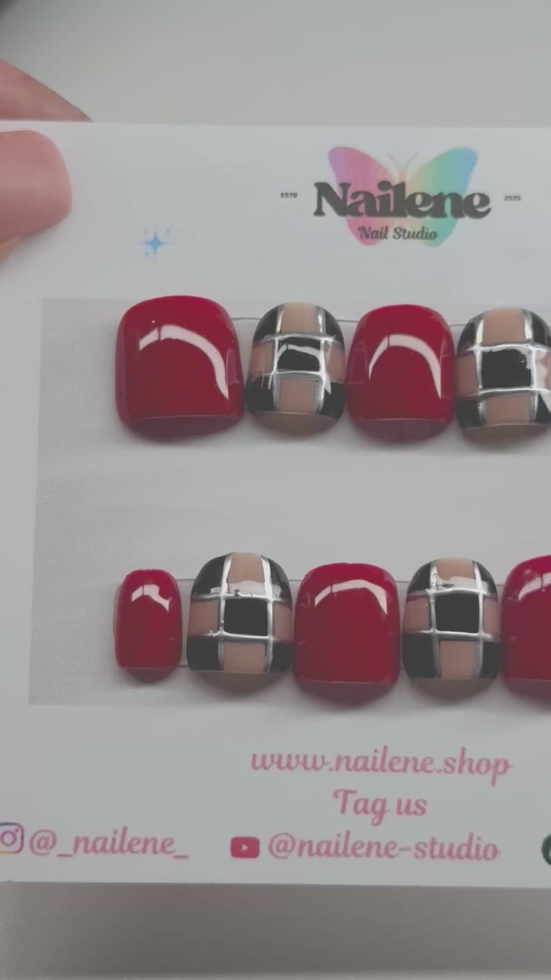 Bold glossy red press-on nails with chic black and nude plaid accents. A timeless, runway-inspired set made to elevate any look effortlessly. 💅✨